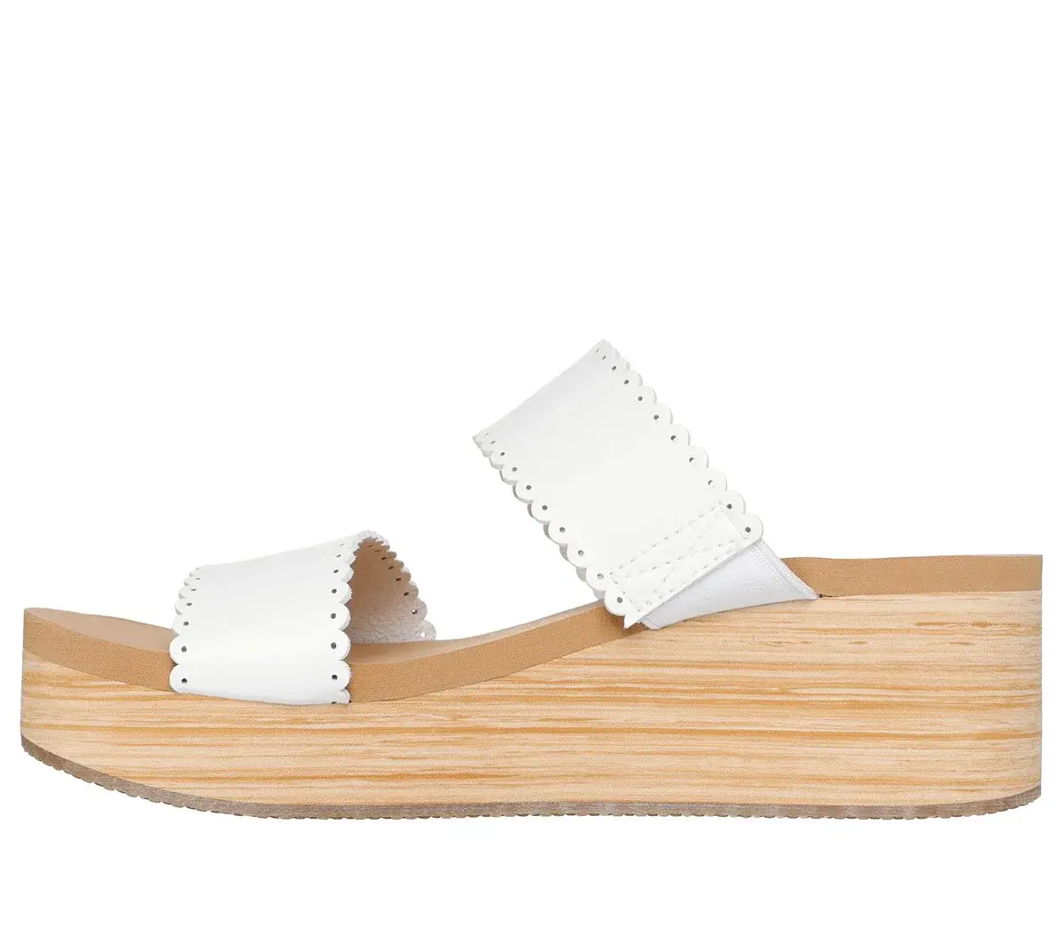 Bring your sunny day style to new heights of comfort wearing Skechers Cali® Summers – Beach Mist. This double-band platform slide features a vegan leather upper with scalloped trim, woodgrain veneer midsole, and a cushioned Luxe Foam® footbed.