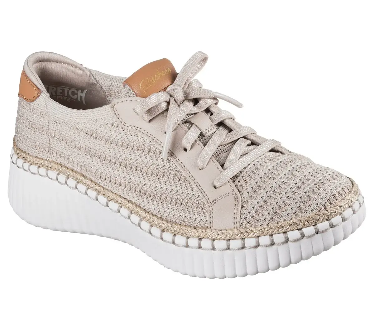 Take a walk on the stylish side in machine-washable comfort with Skechers Wilshire Blvd – Passion Play. This vegan Skechers No Tie Fit® design features a sweater knit upper with faux laces, jute midsole trim, a Comfort Pillow at the heel, and a cushioned Skechers Air-Cooled Memory Foam® insole.